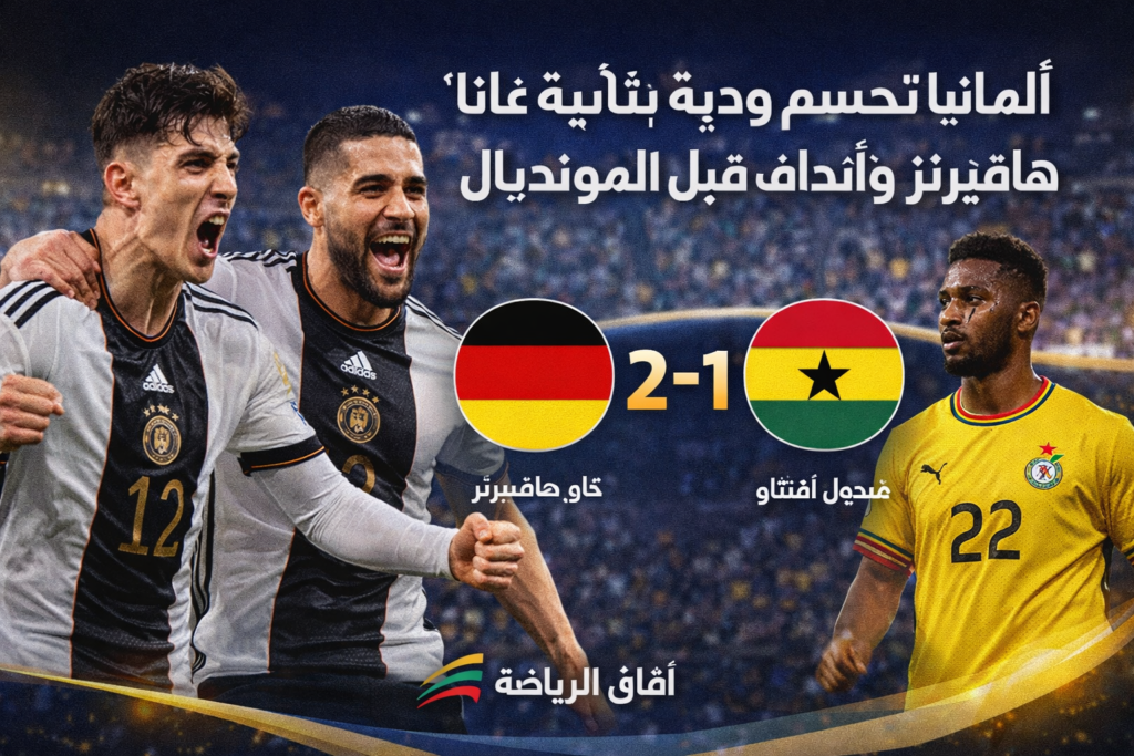 حقق منتخب ألمانيا فوزًا مهمًا على نظيره الغاني بنتيجة 2-1 في المباراة الودية التي جمعتهما يوم 30 مارس 2026 بمدينة شتوتغارت، ضمن التحضيرات الأخيرة لبطولة كأس العالم 2026.