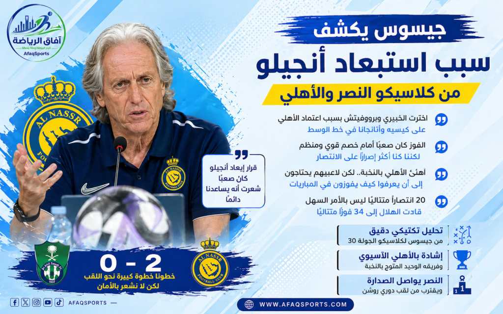 وقال جيسوس بعد فوز النصر بثنائية نظيفة إن قرار إبعاد أنجيلو كان صعبًا، موضحًا أن اختياره جاء بسبب طريقة لعب الأهلي واعتماده على فرانك كيسيه وفالنتين أتانجانا في خط الوسط.